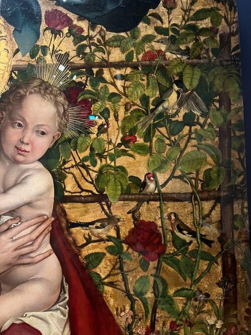 La première partie de l’exposition se concentre sur les œuvres de Martin Schongauer. En premier lieu les peintures. Bien que l’humaniste alsacien Jakob Wimpheling ait indiqué que l’atelier de Martin Schongauer exportait dans toute l’Europe, moins de dix peintures nous sont parvenues. Sauf une, elles sont toutes présentes au Louvre jusqu’au 20 juillet 2026, y compris la Vierge au buisson de roses (1473) réalisée pour le couvent des Dominicains à Colmar.